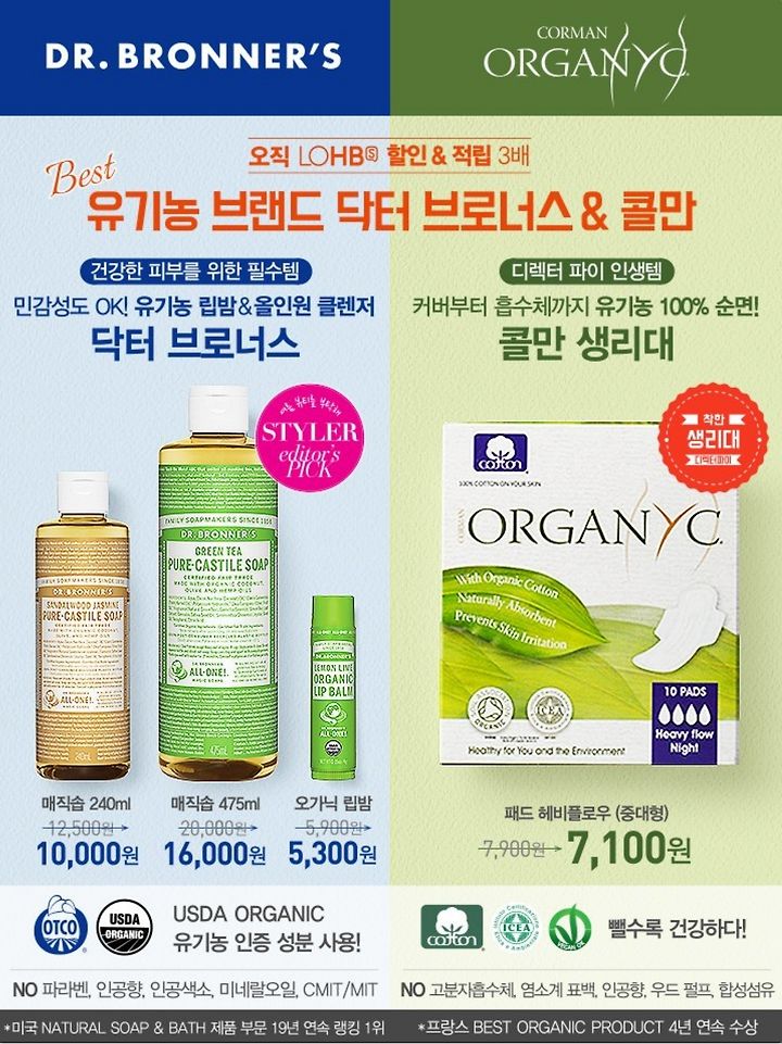 해외 유기농 브랜드인 닥터브로너스와 콜만도 롭스에서 만날 수 있어요. 닥터 브로너스는 유기농 립밤과 클렌저가 유명한데 모두 세일을 합니다. 개인적으로 트래블 키트로 가지고 다니면서 여행때 사용하는 편인데 유기농이라고 해서 제품력이 떨어지거나 세정이 잘 안되는 것도 아니고 사용감도 좋아요.