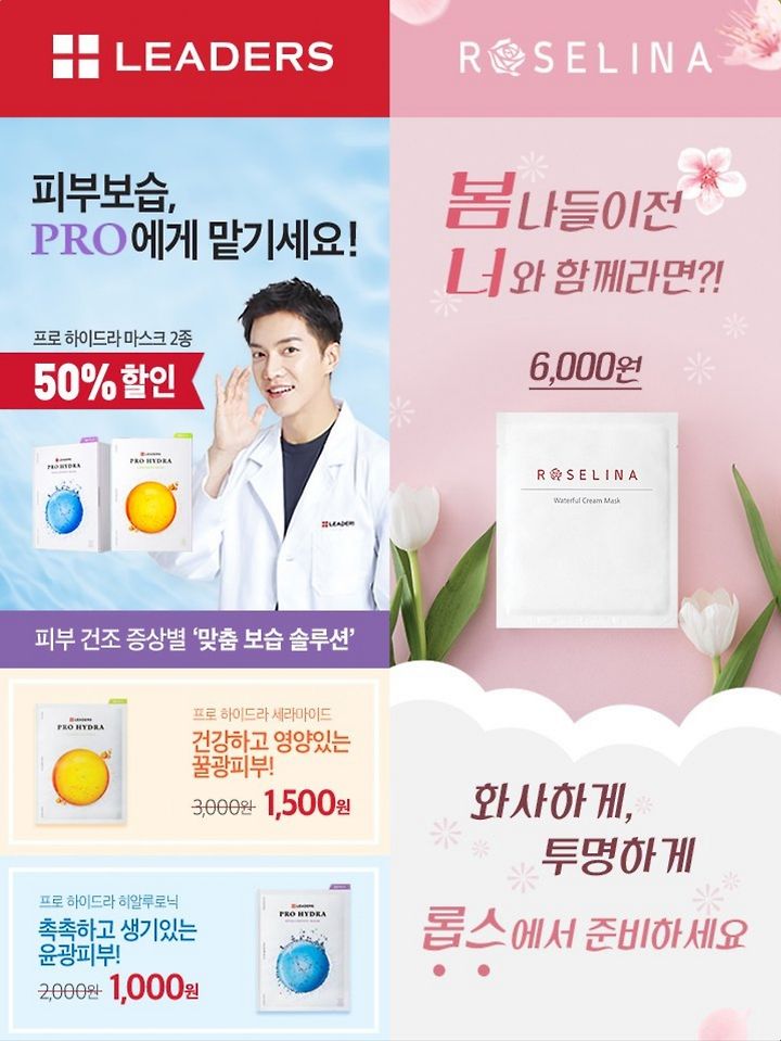 리더스는 마스크팩이 50%를 하더라구요. 보습력 좋은 세라마이드 마스크팩과 수분감 있는 히아루로닉 마스크가 모두 반값이라 여러개 사두고 집에서 마스크팩을 자주 해주시면 좋아요. 로드샵 제품들과 비슷한 가격에 리더스 마스크팩을 만날 수 있어 개이득입니다.