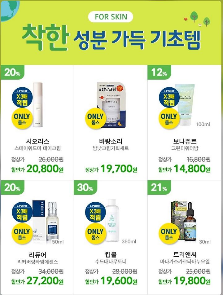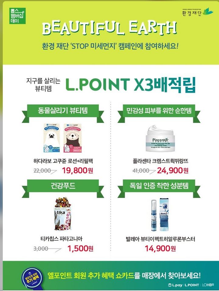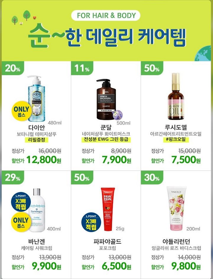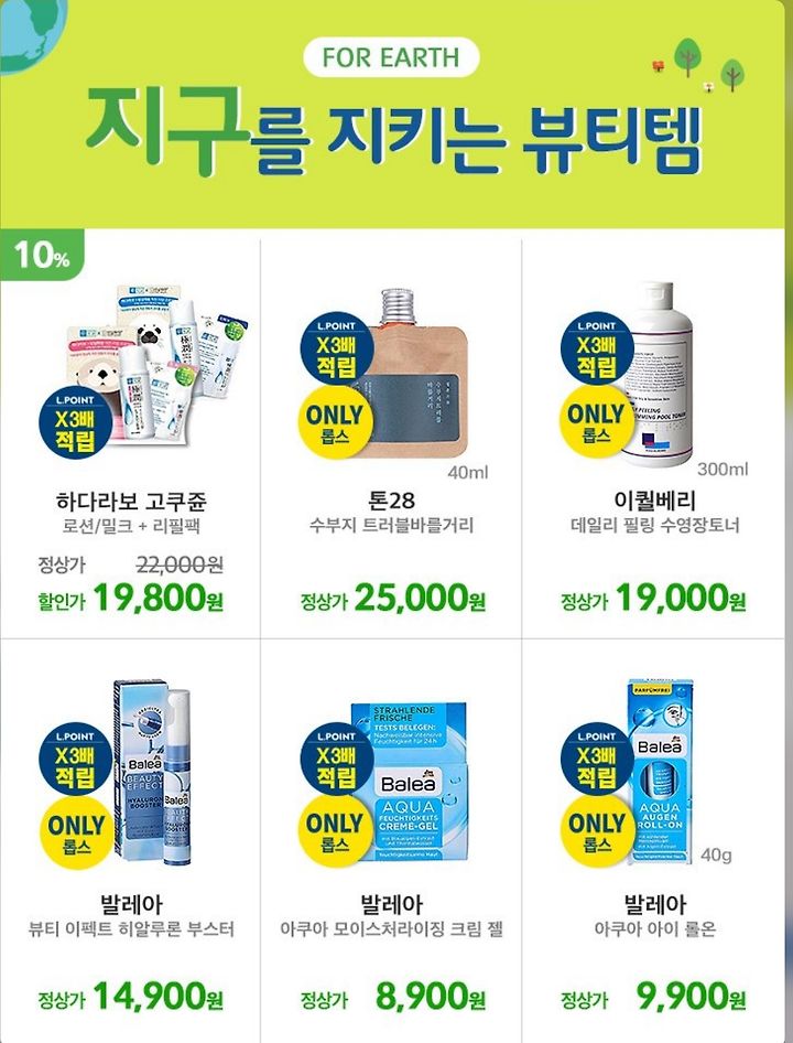 역시 지구의 날 컨셉이기 때문에 지구를 살리는 뷰티템이라는 이름으로 엘포인트 3배 적립이 되는 제품들이 있어요. 매장에서는 엘포인트 회원 추가 혜택이라는 쇼카드를 찾으시면 되는데, 바로 위의 제품들이 세일과 더불어 3배 적립이 가능합니다.