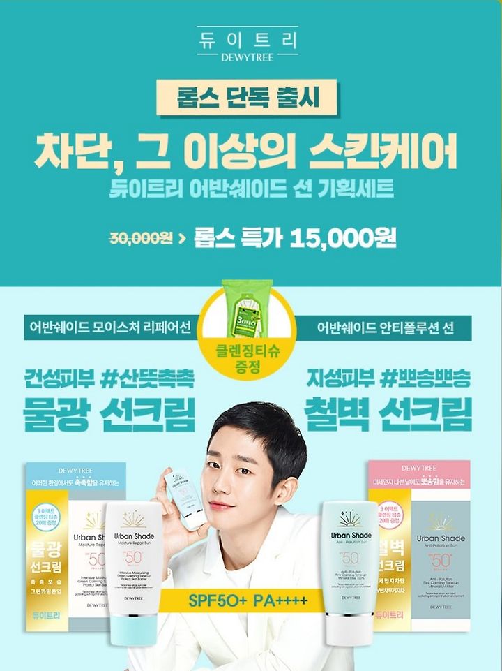 요즘 열일하고 있는 듀이트리도 선 기획세트가 롭스 특가로 15000원이더라구요. 어반쉐이드 모이스처 리페어션은 건성피부에 좋은 촉촉하고 산뜻한 물광 선크림이고, 어반쉐이드 안티폴루선 선은 지성피부에 좋은 보송보송한 선크림입니다.
