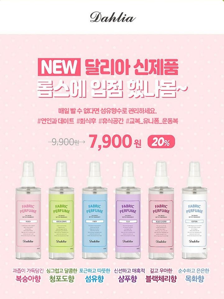 달리아 섬유향수도 롭스에서 만날 수 있는데 20% 세일을 하더라구요. 첫인상에 향기도 정말 중요하게 작용하죠. 하지만 향수를 뿌리는걸 좋아하지 않거나 매일 빨 수 없는 옷에 향기관리를 하고 싶으신 분들은 섬유향수를 사용하면 만족도가 높을거에요.