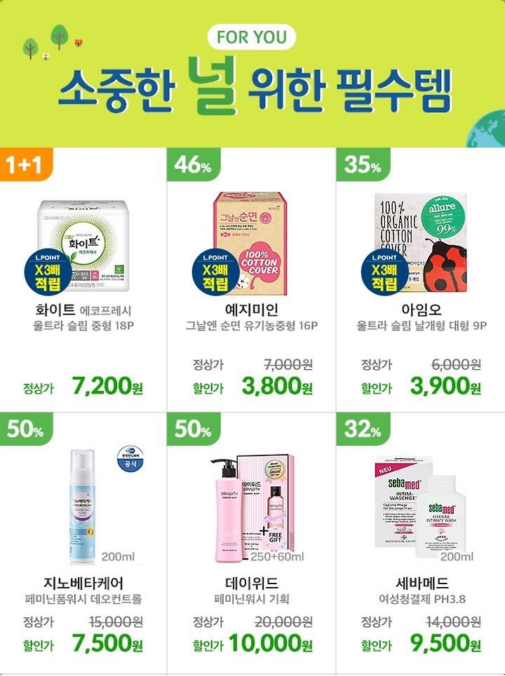 다음은 여성용품들입니다. 예전엔 마트에서 무작정 구매하곤 했는데 요즘에는 이렇게 세일기간에 잘 봐두었다가 구매하면 마트 세일가보다 훨씬 사게 살 수 있을때가 많더라고요.