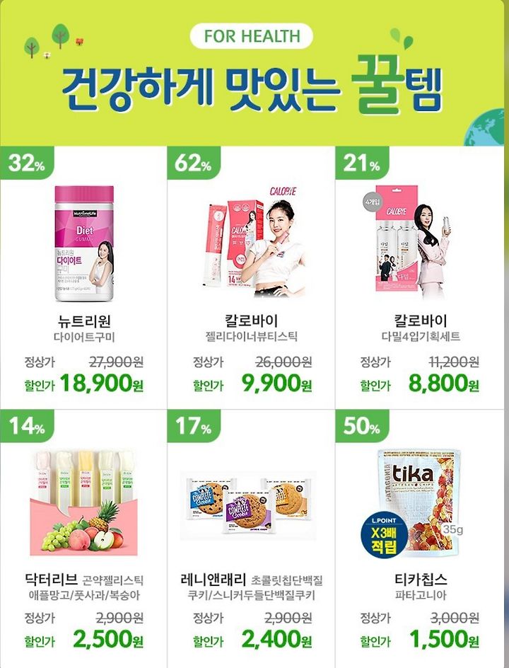 칼로바이 젤리다이너뷰티스틱은 62%할인을 하네요. 티카칩스는 엘포인트 3배 적립과 더불어 50%할인을 합니다. 평소 먹어보고 싶었는데 가격때문에 구매가 망설여졌다면 이런 기회에 한번씩 먹어볼만 하죠.