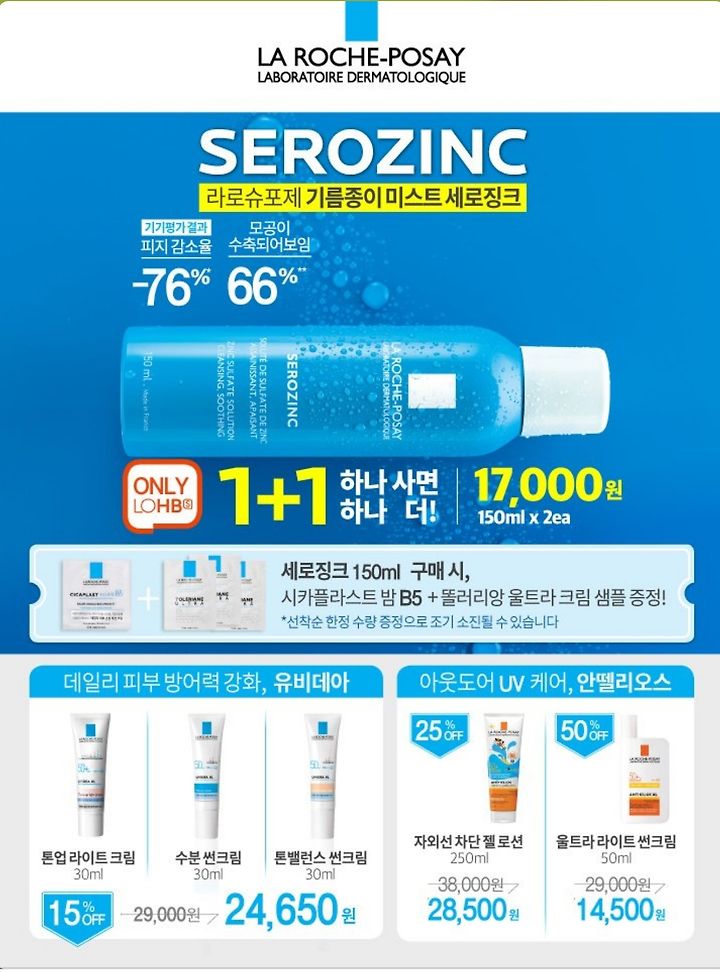 라로슈포제는 약국화장품으로 유명하죠. 롭스에서도 만날 수 있는데 기름종이 미스트인 세로징크는 무려 1+1을 하고 있네요. 피부가 예민하고 아무 화장품이나 사용하기 싫다면 라로슈포제를 사용해보세요. 향료나 컨셉성분이 들어가 있어 알레르기가 있거나 잘 맞지 않을 수 있는 화장품에 비해 만족도가 훨씬 높을거에요.