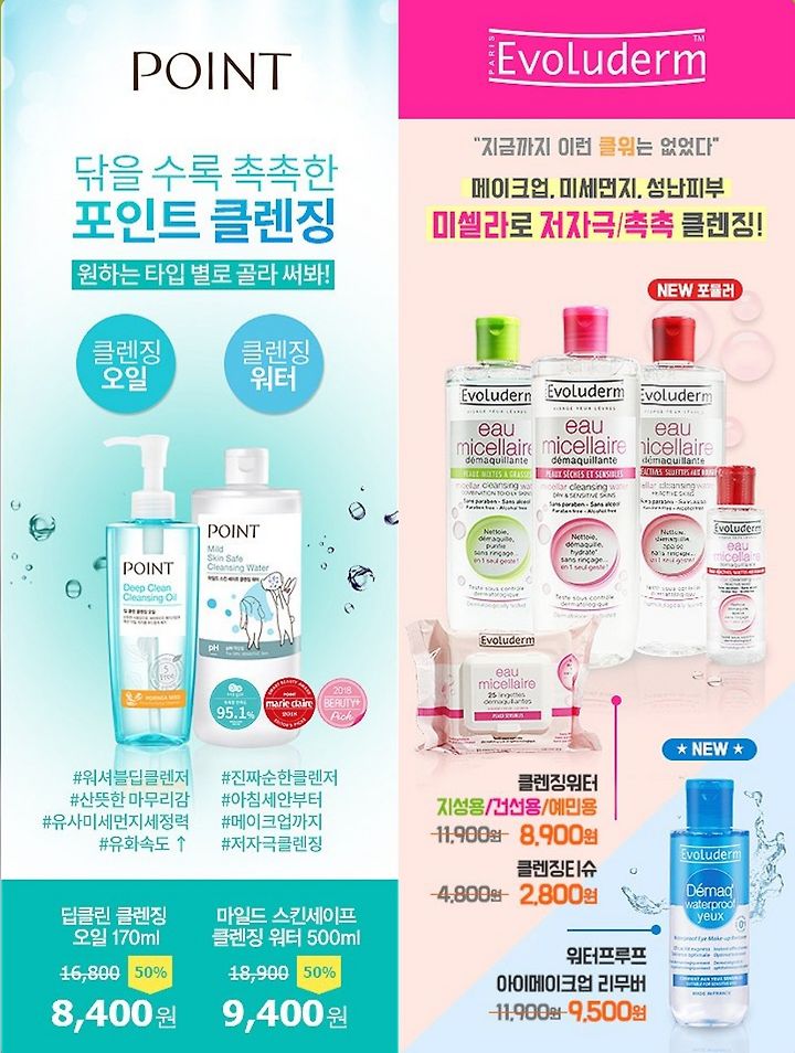 개인적으로 포인트 클렌징 제품이 세정력 좋으면서 자극적이지 않아 포인트 립앤아이리무버를 꾸준히 사용하는데 여기 사진에는 립앤아이리무버가 없네요. 피부에 자극은 없으면서도 세정력 좋고 눈에 들어가도 따갑지 않아서 애정하는 브랜드입니다. 할인폭도 무척 크네요.