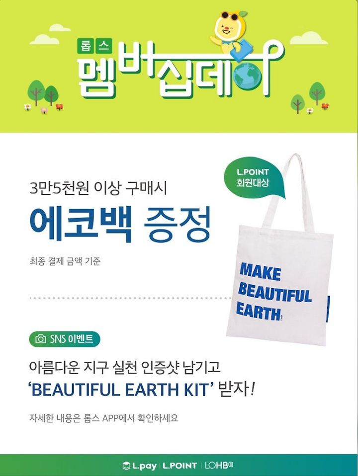 이번 롭스 4월 세일의 컨셉은 지구의 날입니다. 그래서 세일기간인 17일부터 22일 사이에 최정 결제금액이 3만 5천원 이상일 경우 지구의 날 에코백을 받을 수 있어요.